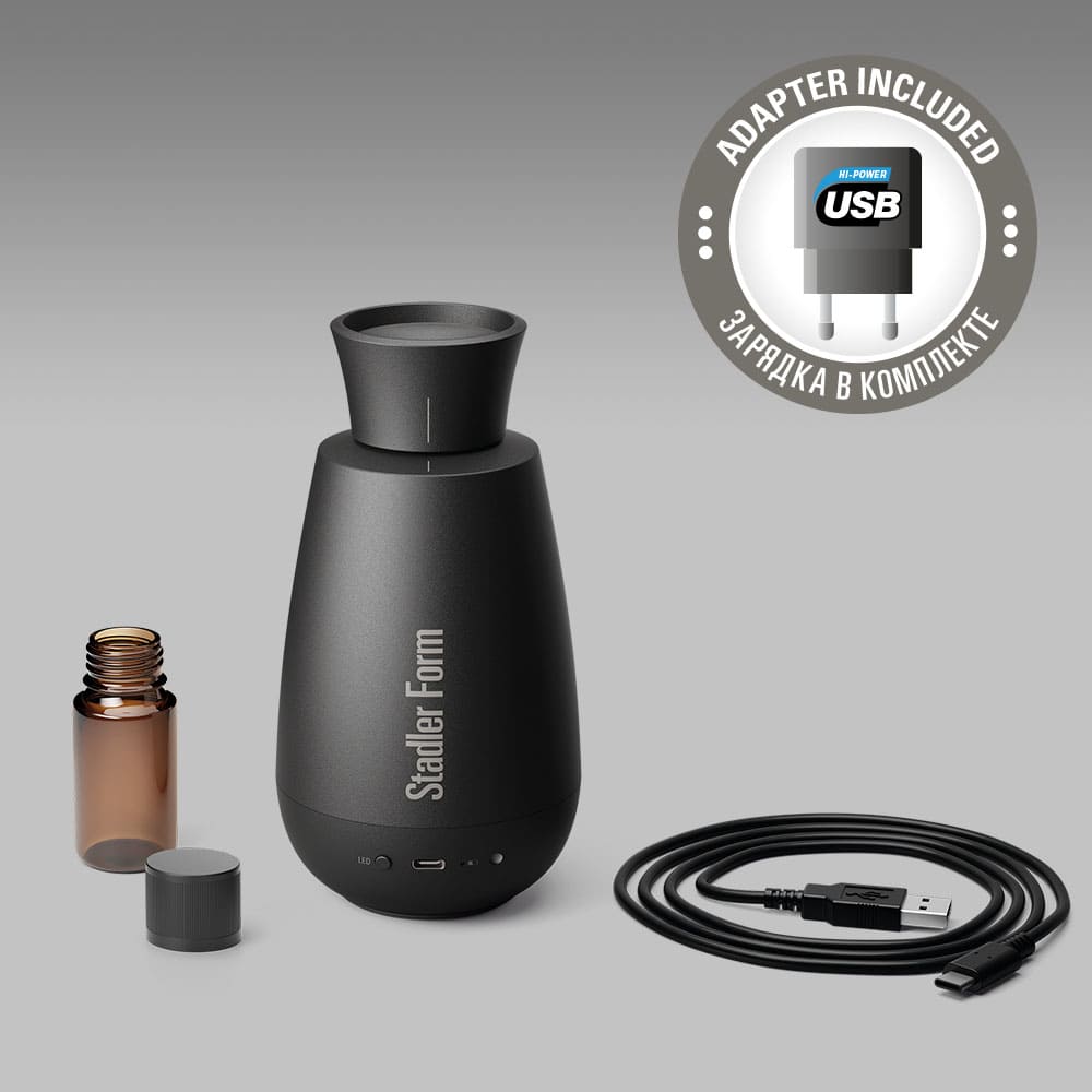 Помимо Ella, в комплект поставки входят пустой флакон ароматического масла объёмом 15 мл, кабель USB-A — USB-C и руководство пользователя. Адаптер питания в комплект не входит. Для зарядки можно подключить кабель USB-C к Ella и подключить его к подходящему источнику питания (ПК, внешнему аккумулятору, USB-порту или адаптеру питания 2 А / 5 В к подходящей розетке).
