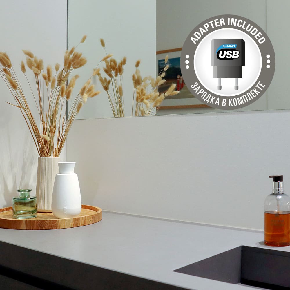 Встроенный аккумулятор обеспечивает до 10 дней автономности на минимальном режиме. Никаких проводов — ставьте Ella там, где хотите: на полке, тумбе или в ванной.