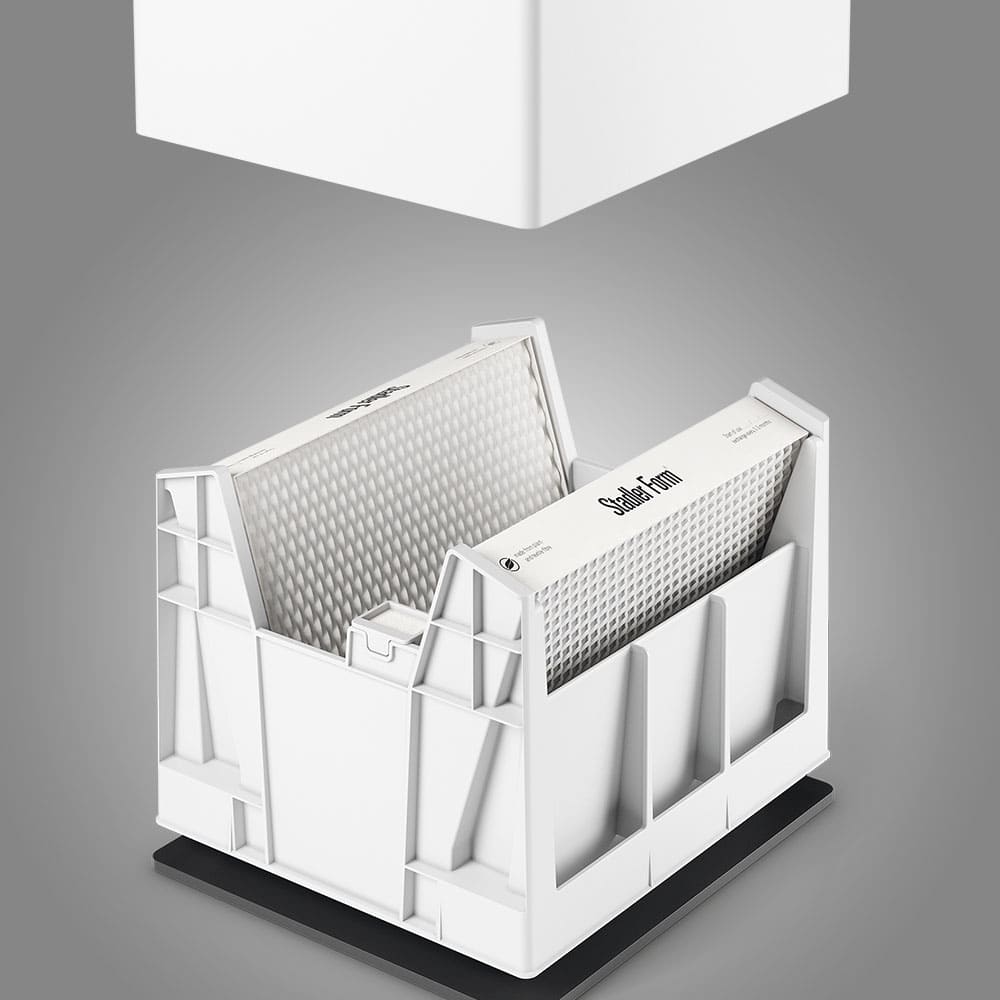 Фильтры Stadler Form отличаются повышенной впитывающей и испаряющей способностью. Их структура вдохновлена формой пчелиных сот, обеспечивающих большую площадь испарения. Каждый фильтр состоит из 12 слоёв с общей площадью 8 568 см² — как лобовое стекло автомобиля.