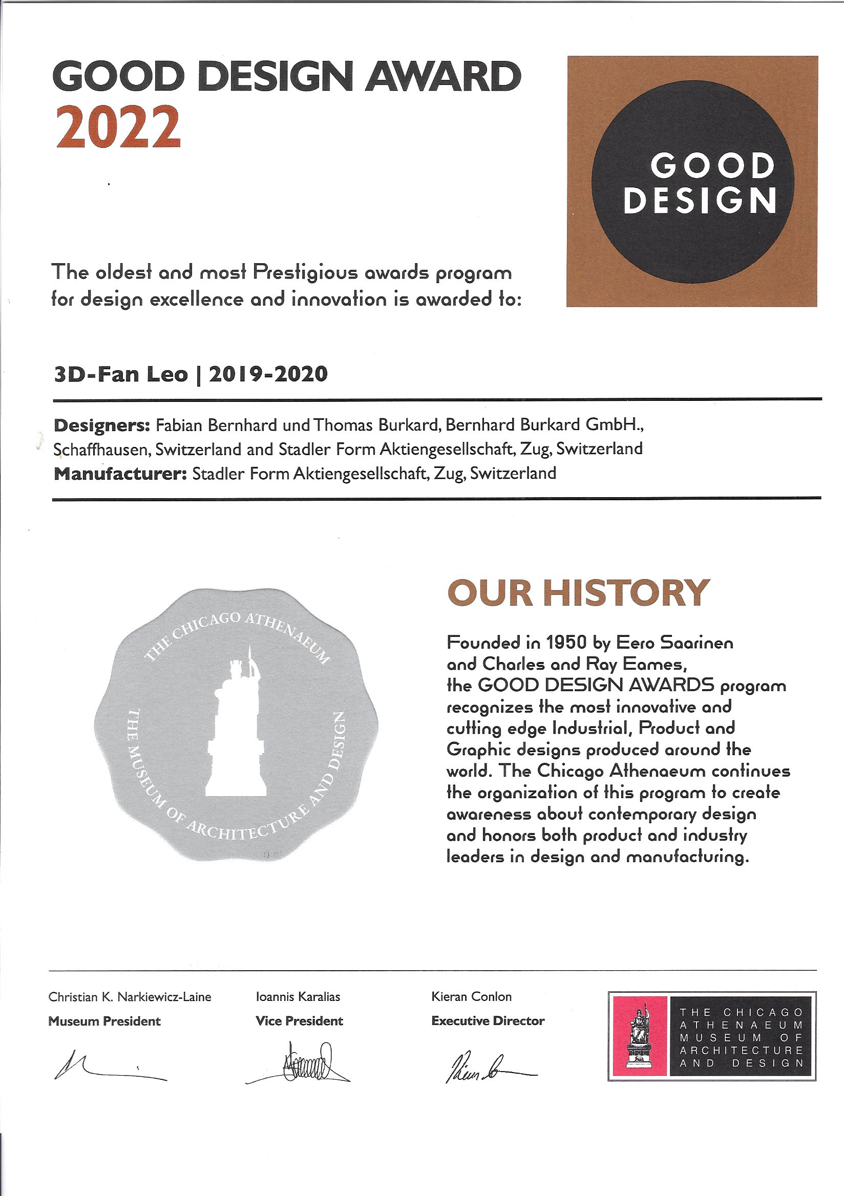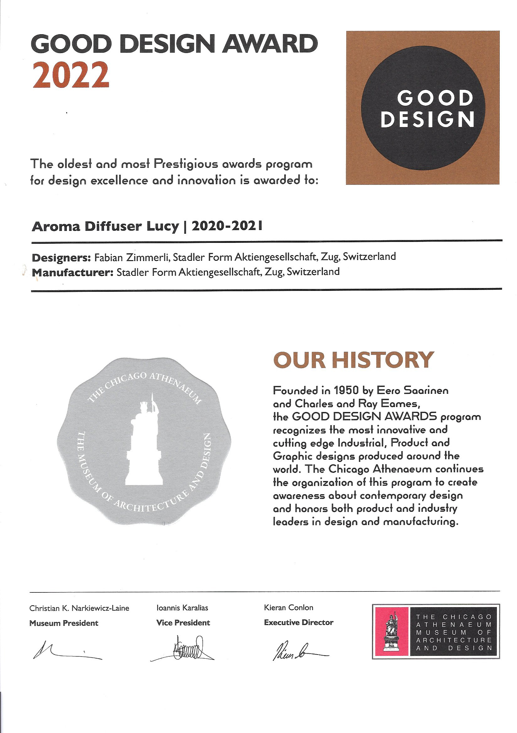 Чикагский музей архитектуры и дизайна «Атеней» ежегодно, с 1950 года, присуждает премию Good Design Award за выдающийся дизайн продукта. Это старейшая и самая престижная в мире премия в области дизайна. Жюри конкурса оценивает продукты по таким критериям, как инновации, дизайн, творчество, экологичность, технологичность.