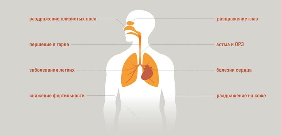 Существуют различные заболевания, которые возникают в результате постоянного пребывания человека в помещениях с низким качеством воздуха. Такими типичными заболеваниями являются: астма, першение в горле, раздражение слизистых носа, глаз, хронические и острые респираторные заболевания, рак легких, сердечные заболевания и снижение фертильности.