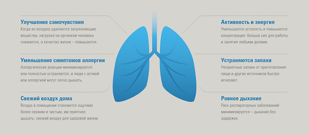 - Загрязняющие вещества удаляются из воздуха, и снижается нагрузка на организм человека: повышается качество повседневной жизни.