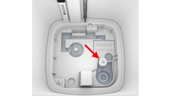 Все устройства, выпущенные в мае 2019 года (серийный номер 1905 xxxxx, см. заводскую табличку на нижней части устройства) или позднее, оснащены новой технологией и, следовательно, поплавковым выключателем. Для начала проверьте, двигается ли поплавковый выключатель (красная стрелка). Возможно, он застрял из-за чрезмерного количества накипи/грязи. Регулярно очищайте поддон для воды от накипи, чтобы обеспечить его бесперебойную работу. Тщательно промывайте поддон для воды Eva теплой водой и убедитесь, что нагревательная пластина и мембраны не покрыты накипью. При необходимости очистите поддон для воды от накипи. Убедитесь, что вода не попадает в отверстие для воздуха в поддоне для воды. Наполните резервуар для воды и снова запустите Eva. Если красный светодиод продолжает гореть, извлеките картридж от накипи (расположен внутри резервуара для воды, прикреплен к крышке) и оставьте Eva работать без картриджа от накипи на 30 минут. Если после этого Eva по-прежнему не работает должным образом, обратитесь к продавцу, у которого вы приобрели Eva, чтобы ее можно было отремонтировать.